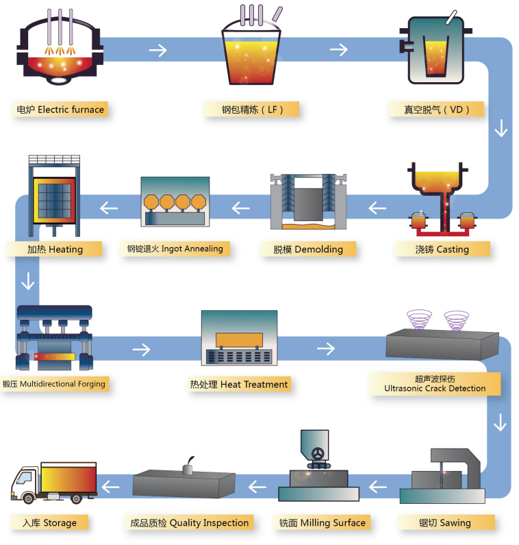 We produce a big range of different qualities with a maximum weight of a single piece of 50T.
